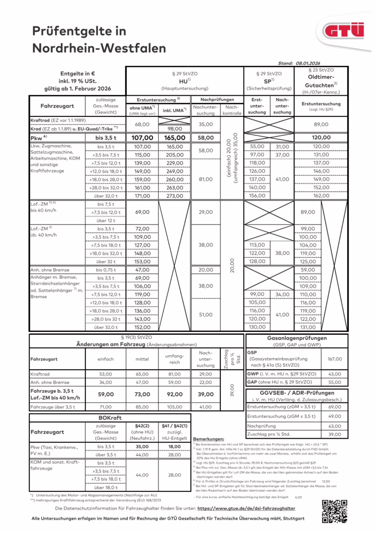 Unsere aktuellen Preise für HU und andere amtlichen Untersuchungen